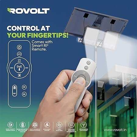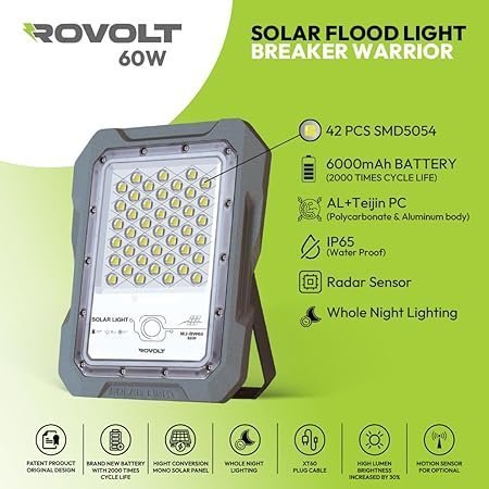 ROVOLT 60W LED Solar Flood Light with Remote Control & Motion Sensor | Aluminium Water Proof Body | 6000 mAh LiFePO4 Battery Solar Security Flood Light | 1 Year Warranty